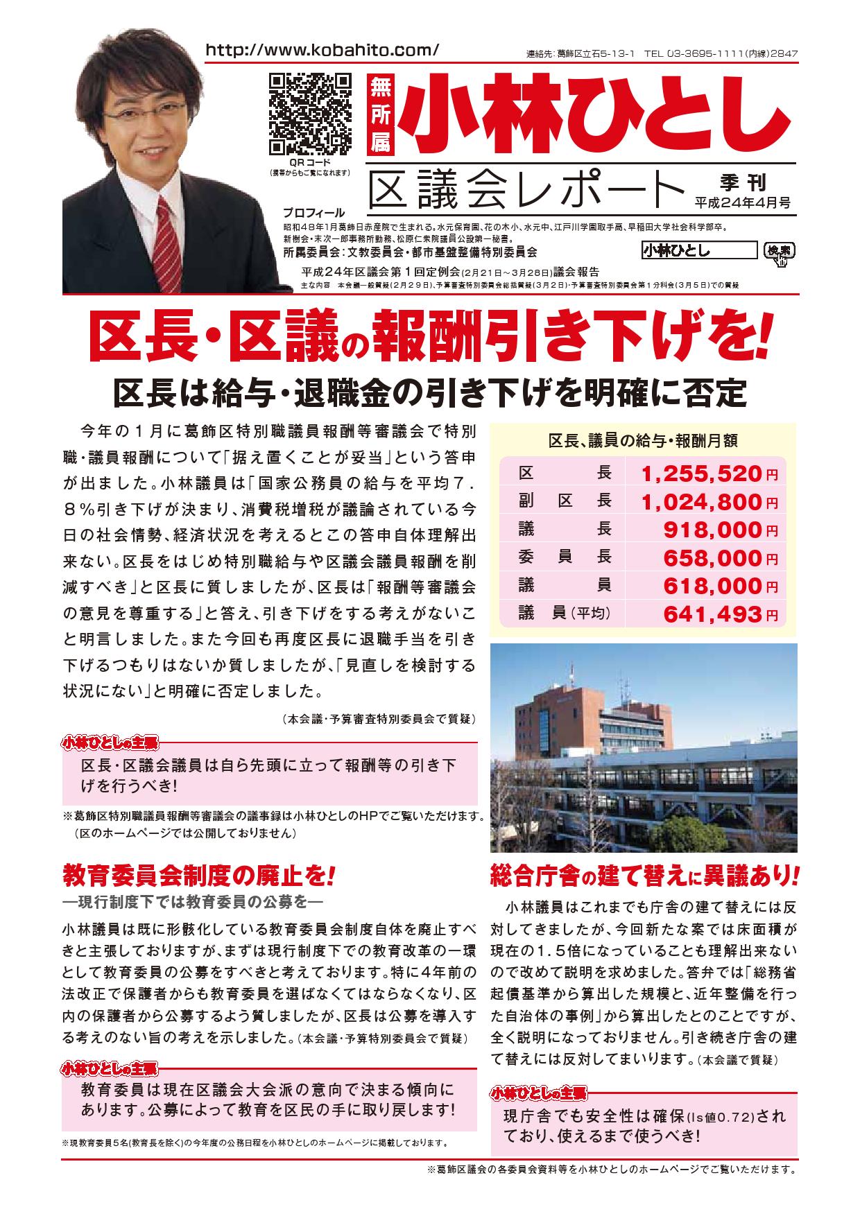 さて、現在、日本の政治は大きく曲がり角に差し掛かっております。野田内閣の支持率は各マスコミの世論調査では危険水域と言われている三十%を割り込み、国民の間では根強い政治に対する不信感が蔓延しております。私自身も今日の日本の政治を憂える一人であります。こうした中、政府は二月十七日に消費税増税を盛り込んだ「税と社会保障の一体改革」の大綱を閣議決定し、今国会では消費税の増税が争点となるなど、いずれにせよこれから益々国民負担の増大が予想される中、国家公務員の給与を七・八%削減する法案が今日成立しました。私は国家公務員の給与を削減するならば、まずその前に国会議員の歳費を削減すべきと思いますが、今の国会議員は一体何を考えているのか分かりません。歳費に加えて国会議員の政治活動費になっている年間三百二十億円にものぼる政党助成金についても大幅に削減すべきと思います。これに対して、大阪市の橋下徹市長は、自らの給与月額百四十二万円を四十二%カットして八十二万円とし、また一期四年間勤めた際の退職金についても削減幅を現行の五十%から八十一%に引き上げて七百五十一万円にする条例案を提出します。葛飾区長の退職金が二千二百四十二万であることは昨年お伺いしましたが、先月私のところに堀切四丁目に住む区民の方から「葛飾区長にも提案してください」とのメールを頂きました。本区においては財政状況が逼迫しているわけではなく、区長は「なぜ削減しなければならないんだ」とお思いでしょうが、国債など国と地方を合わせた債務残高は一千兆円に達することがほぼ確実な情勢で、また今後の社会保障費増大で国民の負担増が避けられそうにない状況であります。また、本区が特別区として都区財政調整制度の恩恵を受けていることを忘れてはなりません。私はこうした状況だからこそ区長自ら引き下げを行うべきと思います。そして報酬については、先月葛飾区特別職議員報酬等審議会の答申があり、「据え置くことが妥当」という結論でしたが、私には全く理解できません。また審議会委員の議事録を見ても誰がどういう発言をなさったか分からいなど責任の所在が不明確であると言わざるを得ません。またこの報酬等審議会には区長の意向を汲み取ってくれる方だけではなく、委員の公募など幅広く区民の声を反映させるべきと考えます。また私が議員一期目の時、すなわち青木勇区長の時代は時限条例で、毎年第一回定例会で恒例行事のように「葛飾区長等の給料等の特例に関する条例の一部を改正する条例」を上程して特別職の給料を十%削減しておりました。青木克徳区長も収入役として在任されていたので明確に覚えておられるのではないでしょうか。政策のほとんどを青木勇前区長の路線を踏襲したにもかかわらず、この件を引き継がなかったのはなぜでしょうか。区長、この際、区議会議員も含めて特別職の報酬削減を提案なさったらいかがでしょうか。私は喜んで賛成いたします。そこでお伺いします。